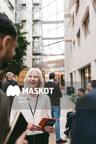 Glad affärskvinna pratar med kollegor på konferens