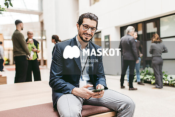 Porträtt av leende affärsman sittande med smartphone