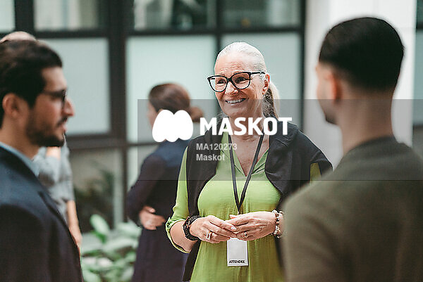 Leende äldre affärskvinna pratar med kollegor