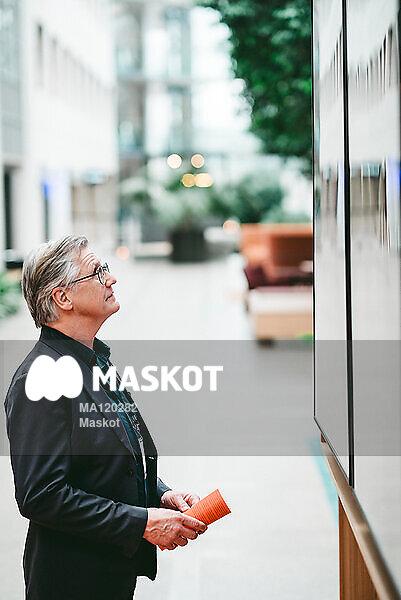 Äldre affärsman tittar på tavla i konferenslokal