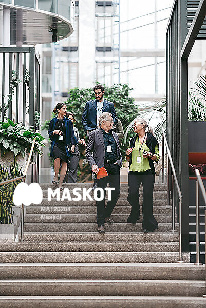 Kollegor diskuterar gående i trappa