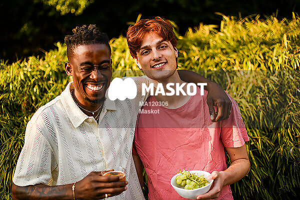 Porträtt av leende ung man med vän