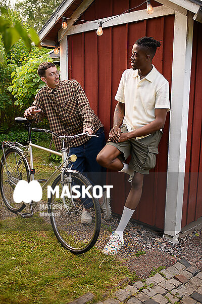 Ung man med cykel pratar med vän