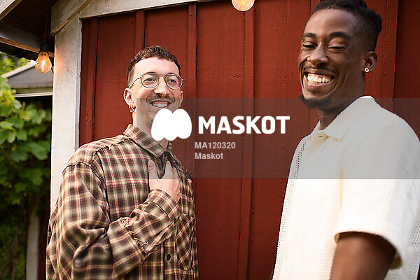 Glada unga manliga vänner pratar