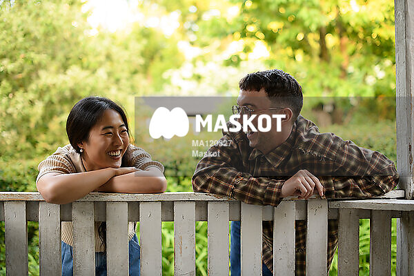 Glada vänner pratar lutande mot räcke