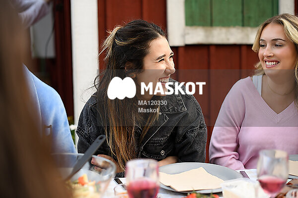 Glad ung kvinna på middag med vänner