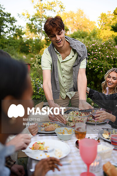 Leende ung man serverar mat till vänner
