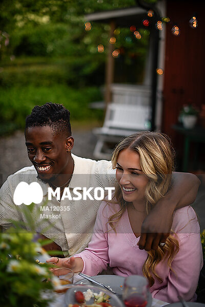 Glad ung man håller om tjej under middag