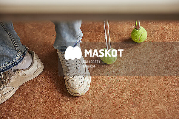 Elev sitter på stol med tennisbollar på
