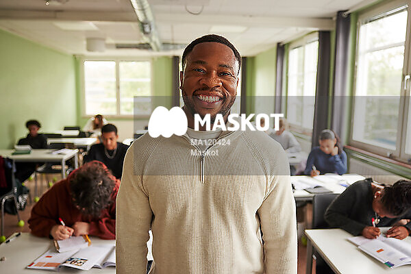 Porträtt av glad manlig lärare i klassrum