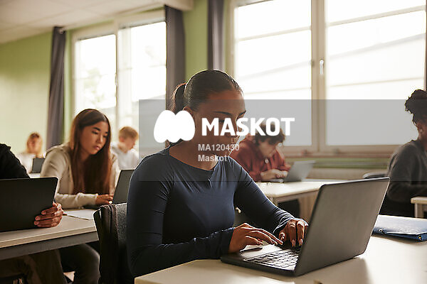 Tonårstjej jobbar på dator i klassrum