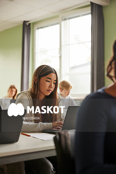 Tonårstjej sitter med dator på lektion