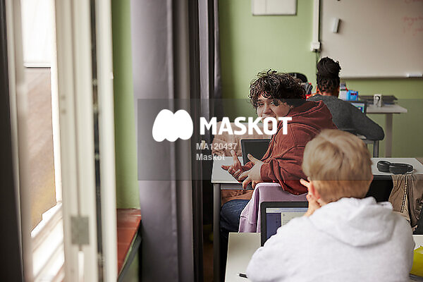 Tonårskille pratar med klasskompis bakom sig