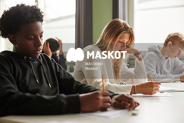 Tonårselever skriver prov i klassrum