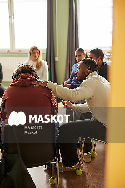 Manlig lärare tröstar elev under gruppsamtal