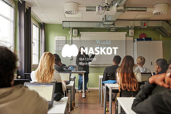 Kvinnlig lärare pratar inför klass under lektion