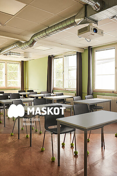 Tomt klassrum med bord och stolar