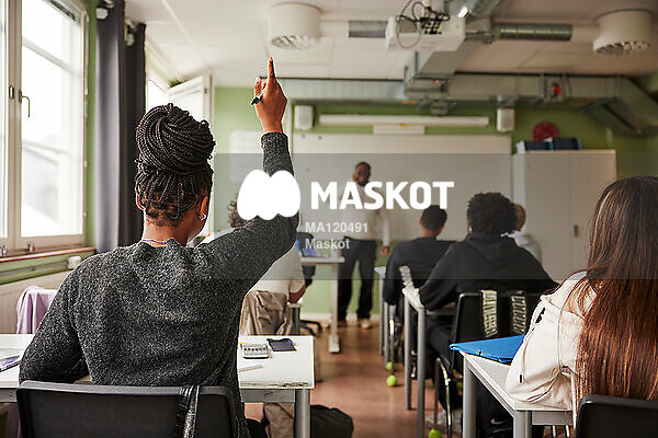 Tonårstjej räcker upp handen i klassrum