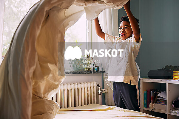 Glad pojke bäddar säng