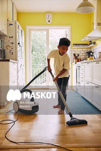 Ung pojke dammsuger i kök