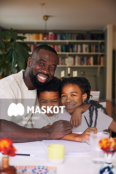 Porträtt av glad pappa som kramar barn