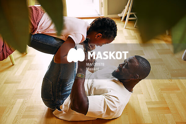 Glad pappa leker med dotter på golv