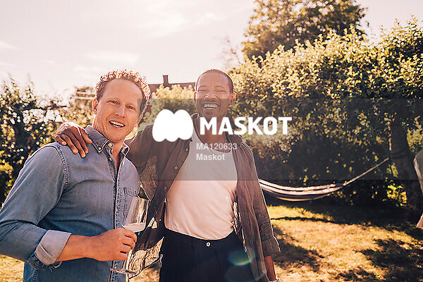 Porträtt av glada män som står i trädgård