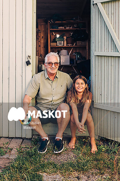 Porträtt av äldre man som sitter med barnbarn vid förråd