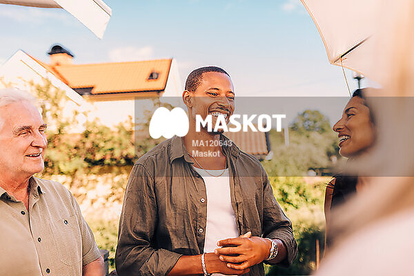 Glad man står med familj i trädgård