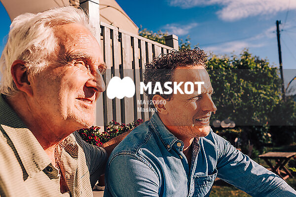 Glad äldre man sitter med son i solljus
