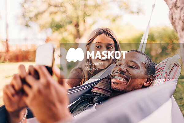 Glad man och dotter kollar mobil i hammock