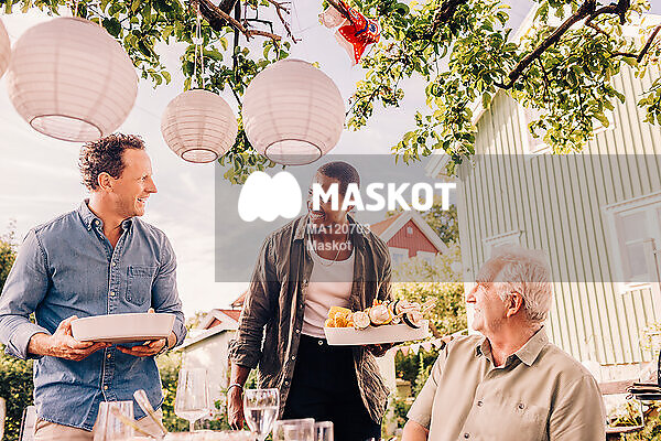 Glada manliga vänner bär mat i trädgård