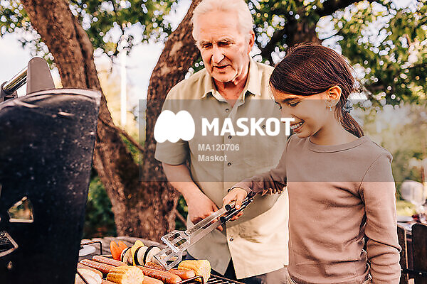 Äldre man grillar med barnbarn