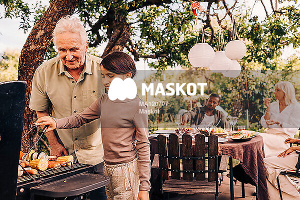 Glad ung flicka grillar med morfar