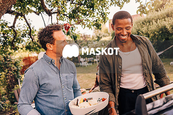 Glada män grillar i trädgård