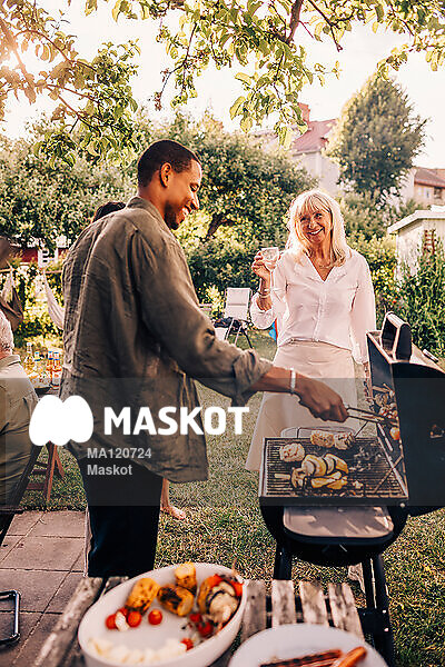 Glad äldre kvinna skålar mot man som grillar i trädgård