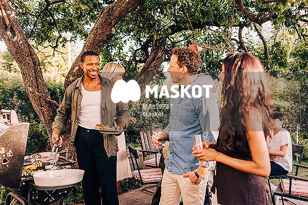 Leende man grillar i trädgård med vänner