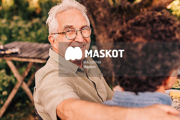 Porträtt av leende äldre man som håller om son i trädgård