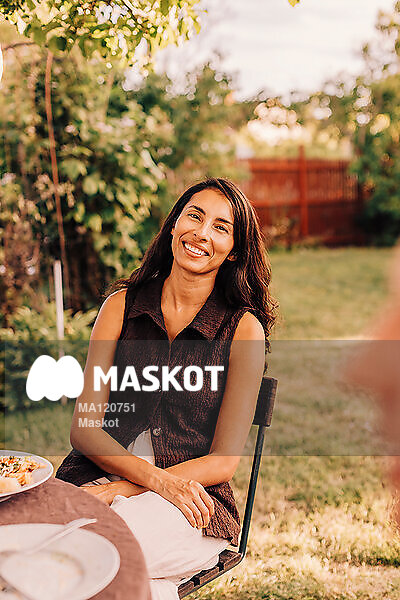 Porträtt av glad kvinna som sitter i trädgård