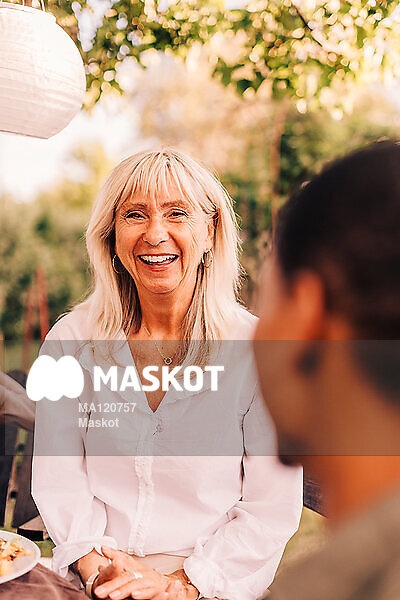 Porträtt av glad äldre kvinna som sitter med vänner i trädgård