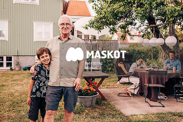 Porträtt av äldre man som står med barnbarn i trädgård