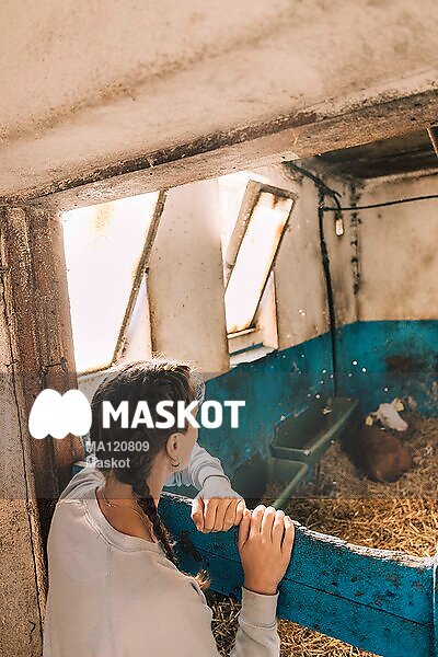 Kvinnlig bonde kollar på kalv