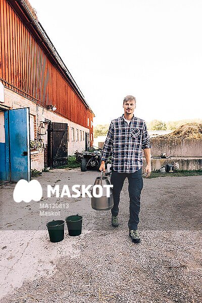 Porträtt av manlig bonde som bär mjölkkanna