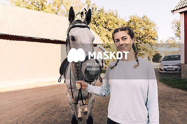 Porträtt av leende kvinnlig bonde som håller häst