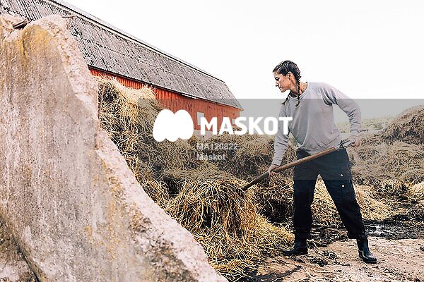 Kvinnlig bonde använder högaffel