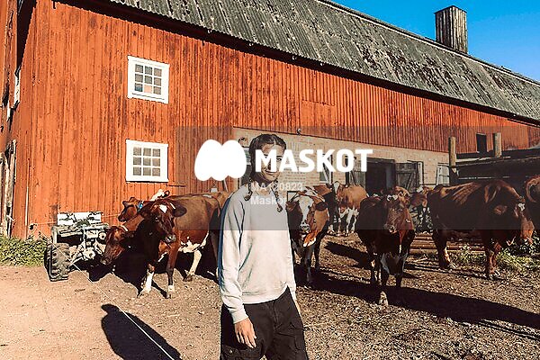 Porträtt av leende kvinnlig bonde som går utanför lada
