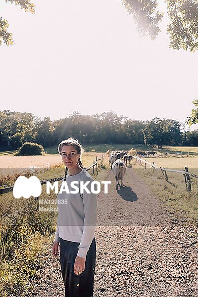 Porträtt av kvinnlig bonde som står på grusväg