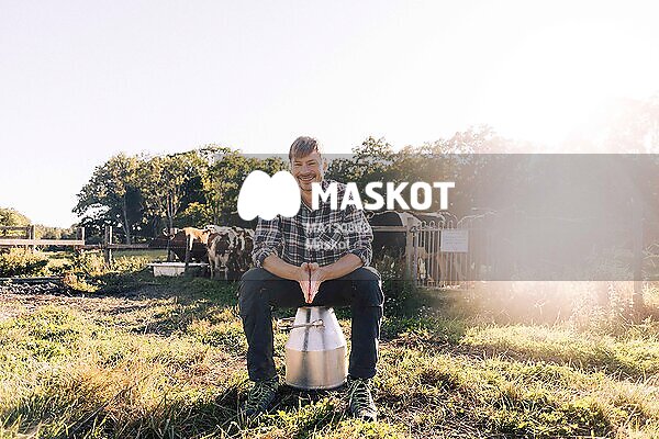 Porträtt av leende manlig bonde som sitter på mjölkkanna