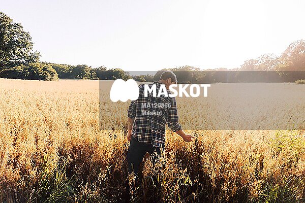 Manlig bonde går bland vete