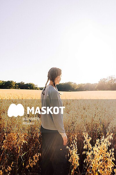 Kvinnlig bonde står i vetefält